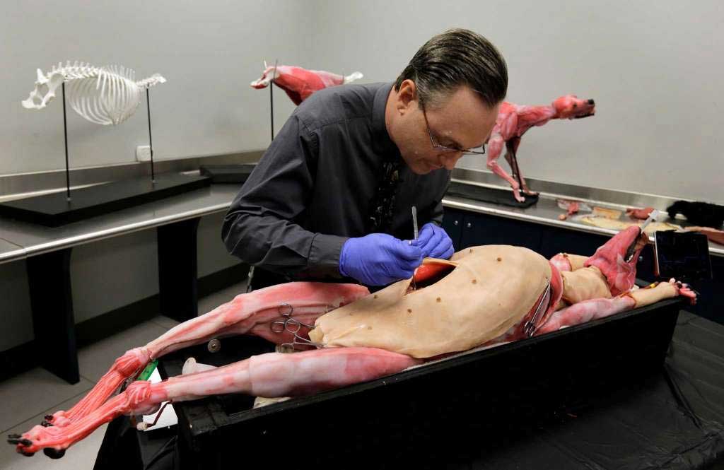 SynDaver’s cadavers, both human and canine, are created with functioning bodily systems, complete with a heartbeat, a circulatory system, lungs that inflate and flesh that bleeds when cut. The skin is creepily chilly and the rubbery organs are clammy to the touch.
