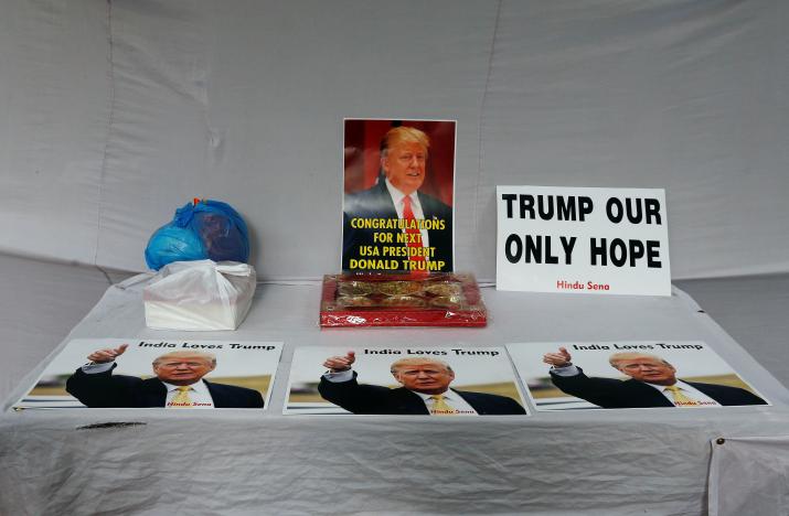 Posters of U.S. Republican presidential nominee Donald Trump are seen kept on a table during an event where members of Hindu Sena, a right-wing Hindu group, gather to symbolically celebrate his victory in the upcoming U.S. elections, in New Delhi, India, November 4, 2016. REUTERS/Adnan Abidi