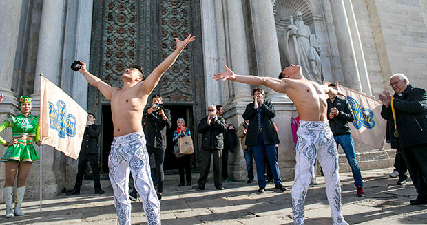 Giang Quoc Co and Giang Quoc Nghiep climbed the stairs of Cathedral of Girona in Spain with one sibling balanced atop the other using only head-to-head contact.