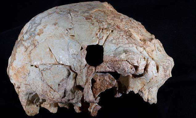 Images of the skull show a circular hole, which represents the damage incurred during the excavation.