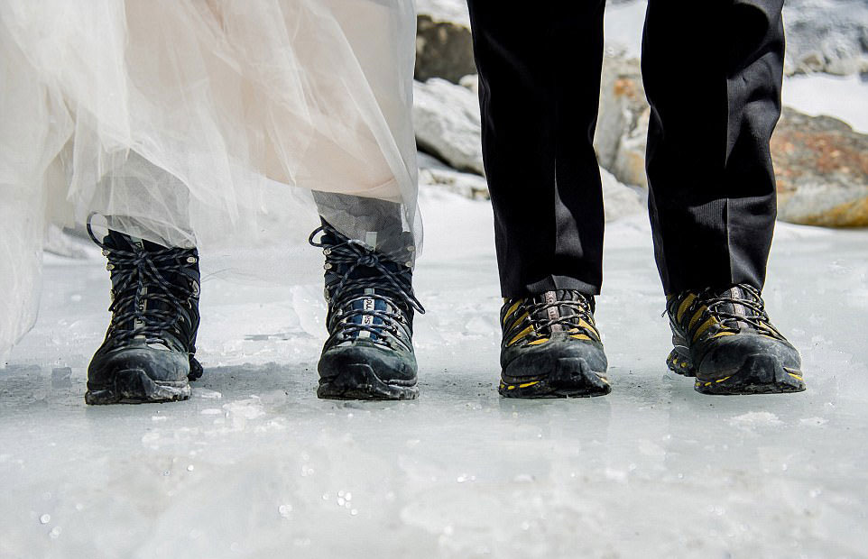 Wearing hiking boots, the bride was smartly dressed in an embellished gown while the groom looked dapper in a black suit.