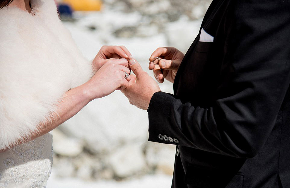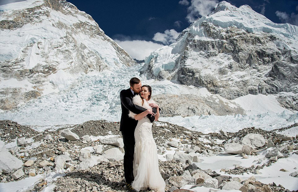 James Sissom, 35, and Ashley Schmieder, 32 spend three weeks trekking through the snow to exchange vows and rings 17,000ft above sea level.