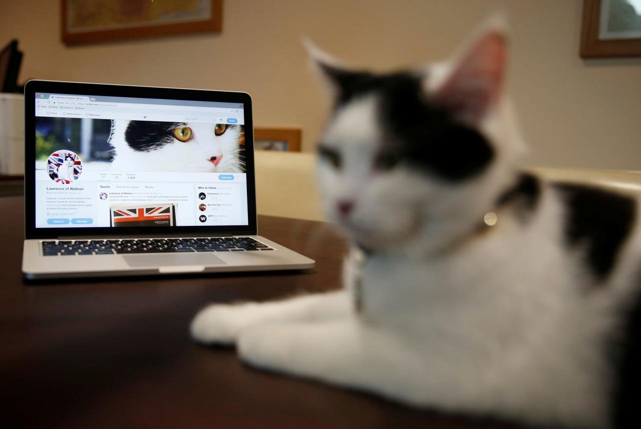 Lawrence of Abdoun, the first diplo-cat to be appointed by the British Embassy in Jordan sits next to a laptop that shows its official Twitter account at the embassy headquarters in Amman, Jordan. --- Reuters