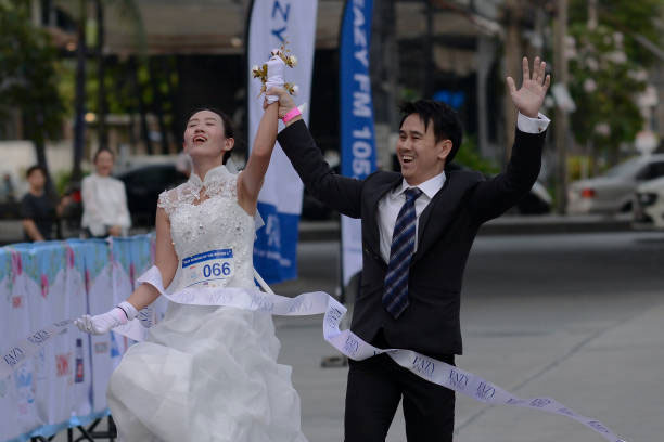 Summary The brides and grooms-to-be ran a 2.4 mile course hoping to win more than two million baht.