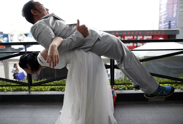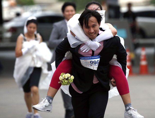 Thai groom-to-be Nutthawut Nakajun carries his bride-to-be Jirawan Kirdsang as they compete in the “Running of the Brides” event. EPA/EFE