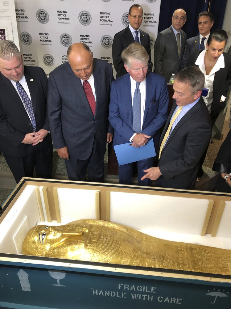 Manhattan District Attorney Cyrus Vance Jr. and Egypt’s foreign minister Sameh Hassan Shoukry held a repatriation ceremony in New York on Wednesday for the Coffin of Nedjemankh (neh’-jeh-MAHNK’).