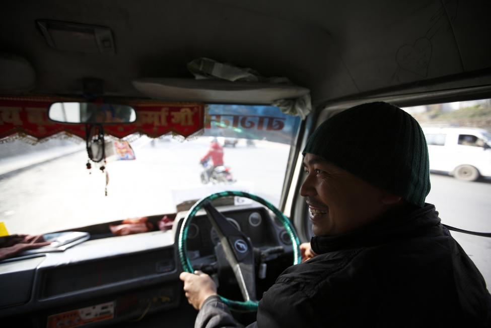 Janak Shrestha, the driver of a women-only bus, smiles as he speaks with a passenger (unseen) in Kathmandu - Reuters