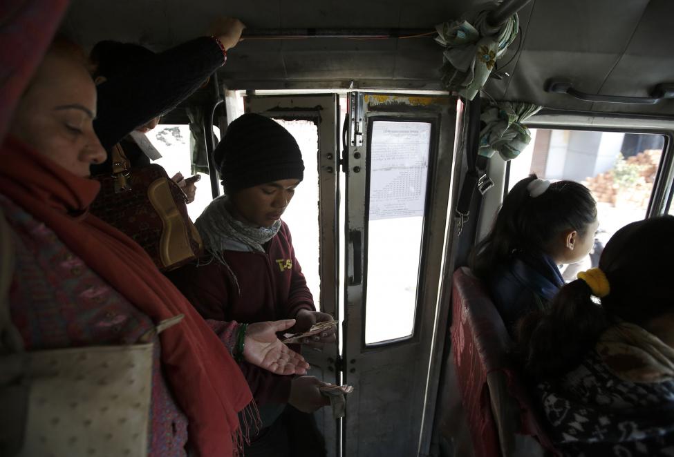 Suraj Shrestha (C), the conductor of a women-only bus, collects the bus fare from a passenger - Reuters