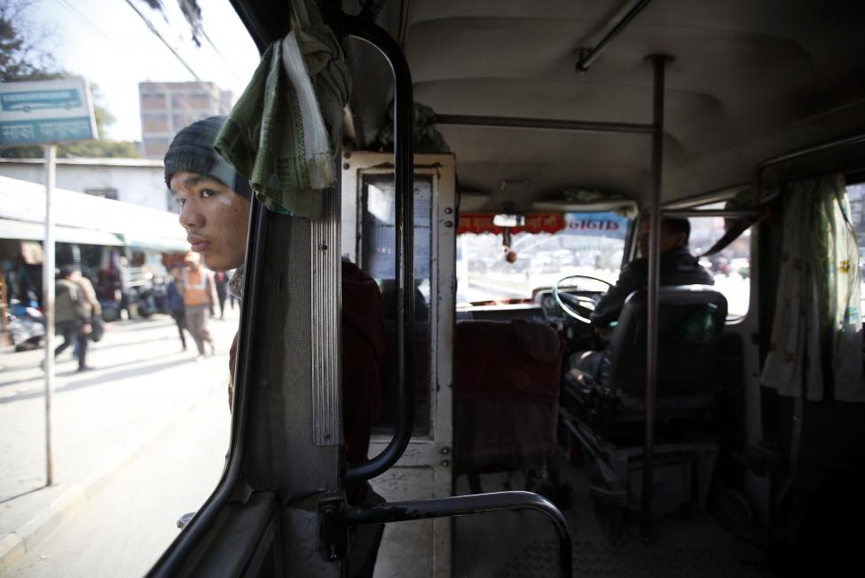 Suraj Shrestha, the conductor of a women-only bus, stands at the bus door as he waits for women passengers at the bus stand - Reuters