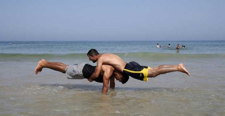 With passersby looking on as they enjoy the relative cool of late afternoon on the Gaza beach, the 23-year-old Palestinian carries out a series of exercises with ease as he calls the names in English, alternating between the "human flag," "back and front lever" and "muscle up".