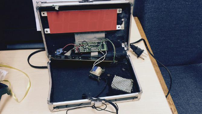 A photo provided by police showed a flat, rectangular red digital clock face screwed into the dark plush interior of a silver case along with a circuit board and some wires.