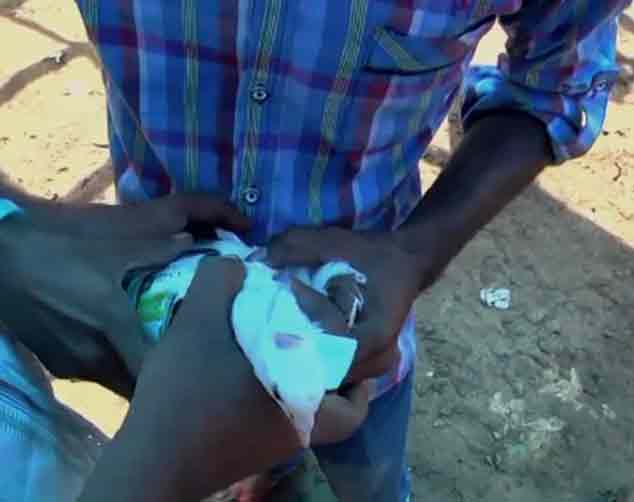 Footage shows men stuffing the birds in to a rocket before the ceremony in the West Godavari district of Hyderabad in southern India.