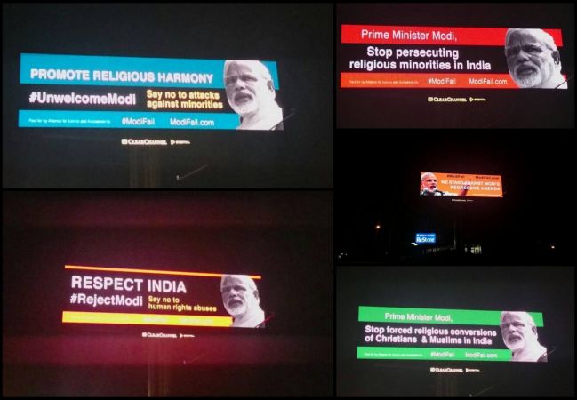 According to International Business Times (IBT) report, massive digital hoardings also came up in San Jose, California ahead of the much anticipated grand reception at SAP Center organised for Prime Minister Narendra Modi, accusing him of implementing "regressive" policies in India that hamper "freedoms and human rights" of Indian communities.