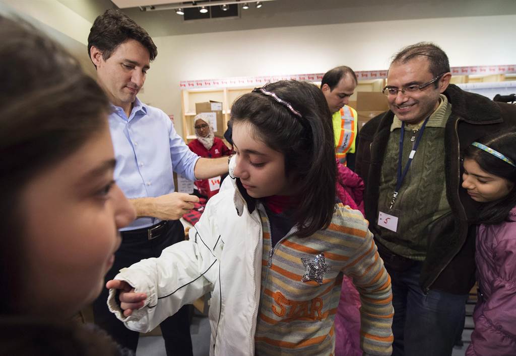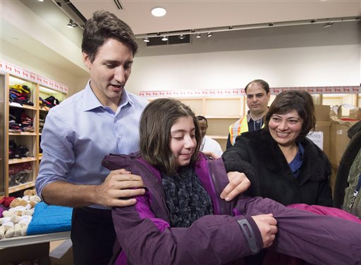 Prime Minister Justin Trudeau helps a young Syrian refugee try on a winter coat