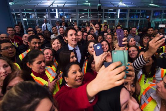 Canadian PM Justin Trudeau, centre, poses for a selfies with workers before he greets refugees from Syria