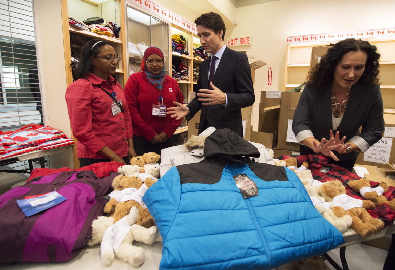 Canadian PM Justin Trudeau, centre, looks over winter clothing which will be handed out to arriving Syrian refugees