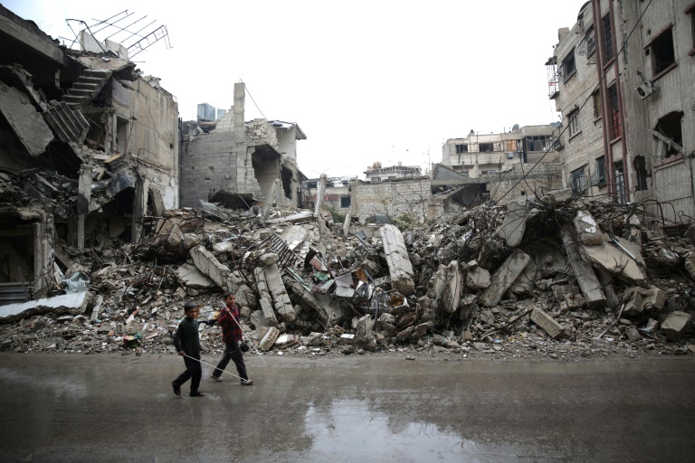 Syrian children walk past the rubble of destroyed buildings in the rebel-held area of Douma, east of Damascus on November 17, 2015