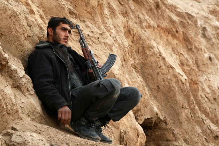A Syrian rebel fighter, reportedly belonging to the Faylaq al-Rahman brigade, holds a position during an operation in the area of Marj al-Sultan s military airport, on December 17, 2015