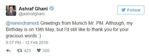 PM took to the Twitter to greet Afghanistan president Ashraf Ghani ‘a happy birthday’. He posted “Happy birthday @ashrafghani. Praying for your long life and exceptional health”.