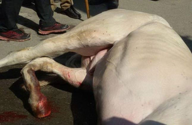 Senior police superintendent Sadanand Datte told AFP that television footage showed the animal’s leg becoming entangled in an iron mesh as it tried to stay upright in the melee of the protest.