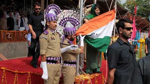 As Mehbooba left the stage for inspecting the contingents of the police and paramilitary forces, the security staff at the Bakhshi Stadium hurriedly hoisted it atop the post.