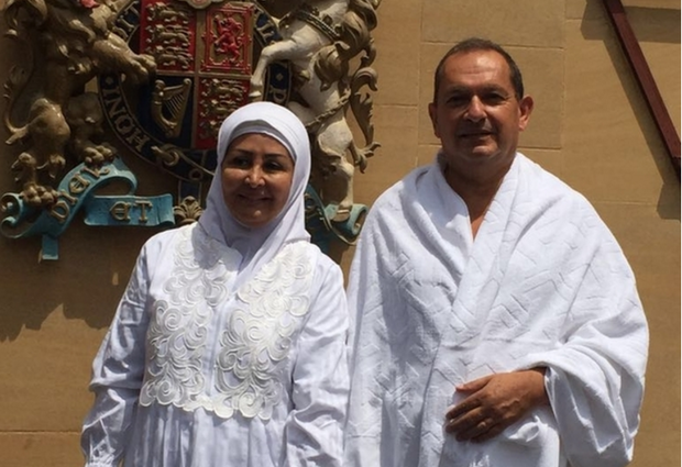 Pictures of him and his Syrian Muslim wife Huda al-Mujarkech, dressed in the traditional white Ihram garments for the pilgrimage, were posted on Twitter by Fawziah Albakr from the King Saud University, who wrote in Arabic: ‘The first British ambassador to the Kingdom leads the pilgrimage after his conversion to Islam: Simon Collis with his wife Mrs. Huda in Makkah. Praise be to Allah.’