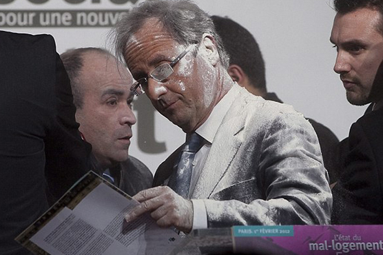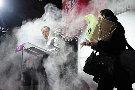The former prime minister was making his way to the stage in a hall in the eastern city of Strasbourg when a shaven-headed man in a T-shirt bearing the slogan "Students for Fillon" emptied a packet of flour on his face and down his suit.