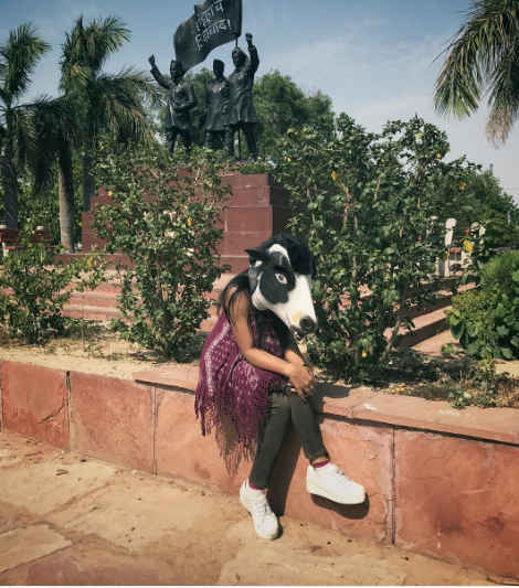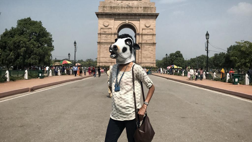 Woman wearing cow mask in front of Delhi Gate. Photo courtesy: Google Images