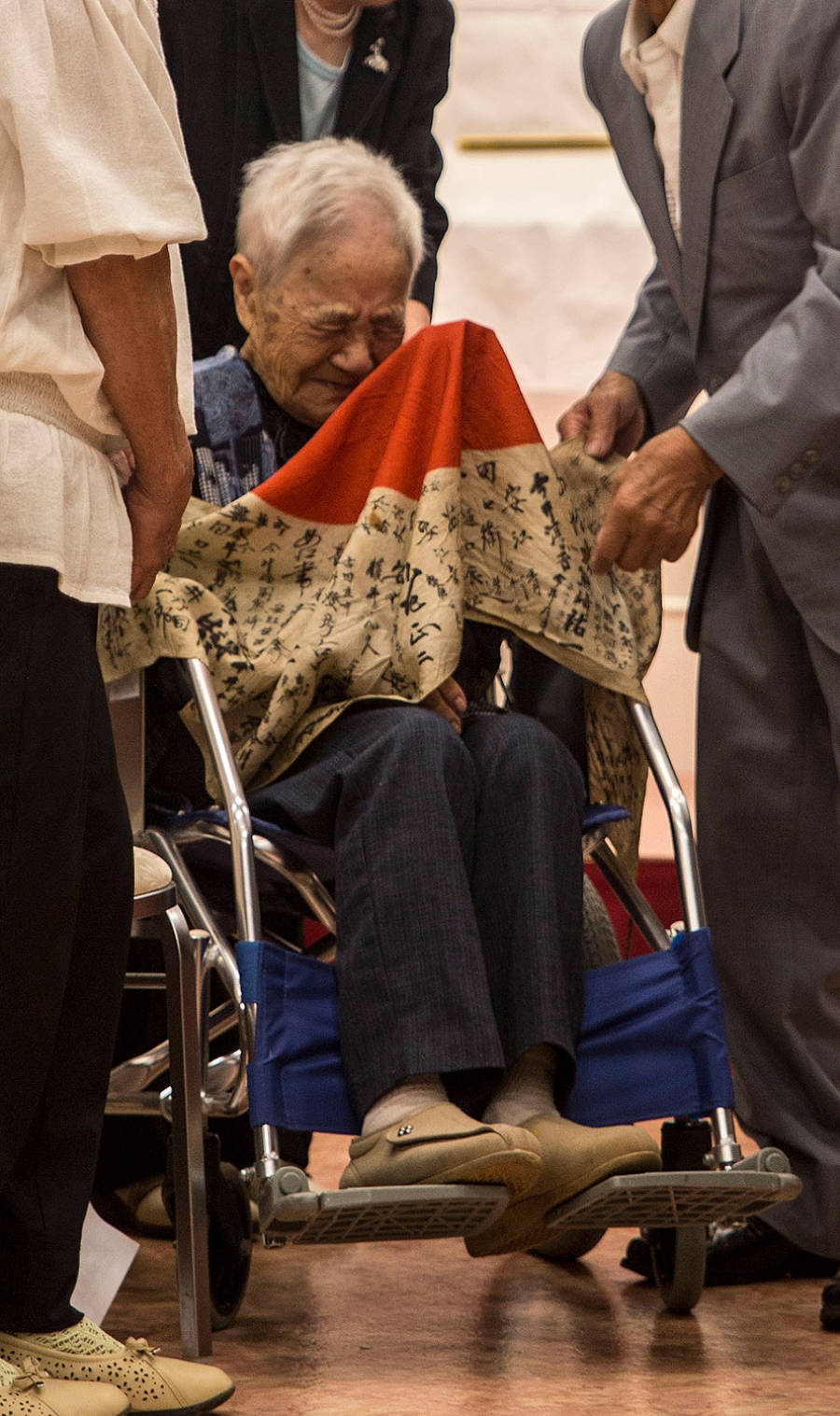 Sayoko Furuta, 93, gets emotional after a Japanese flag with autographed messages which was owned by her brother Sadao Yasue, was returned during a ceremony in Higashishirakawa, Photo: N.W. Huertas/U.S. Marine Corps