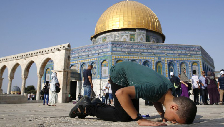 A Palestinian boy from Gaza prays outside the Dome of the Rock mosque in the Al-Aqsa mosque compound in Jerusalem s old city. Photo: Getty