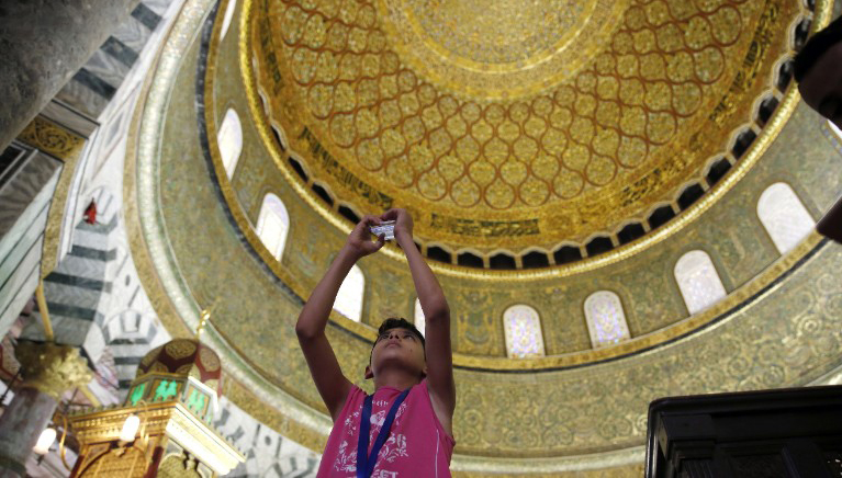 A Palestinian boy from Gaza takes a photo inside the Dome of the Rock mosque. Photo: Getty