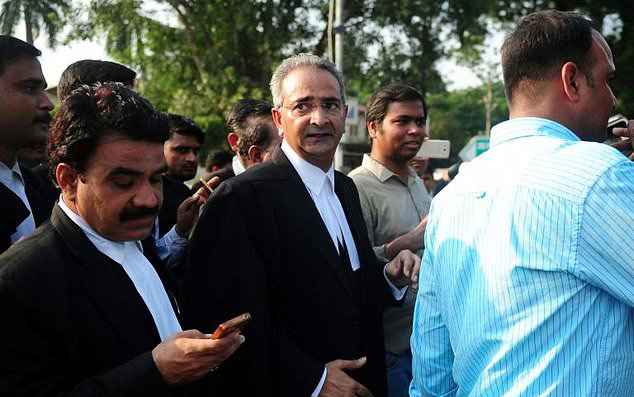 Indian lawyer Tanveer Ahmed Mir (C) leaves Allahabad high court after the acquittal of his clients Rajesh and Nupur Talwar. Photo: AFP