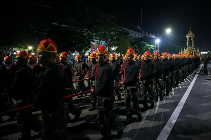 (Reuters) - Drums and a band played as officials in black tops and ancient costumes rehearsed on Saturday for the funeral procession of Thailand’s late King Bhumibol Adulyadej, whose cremation next week is expected to be attended by a quarter of a million mourners.