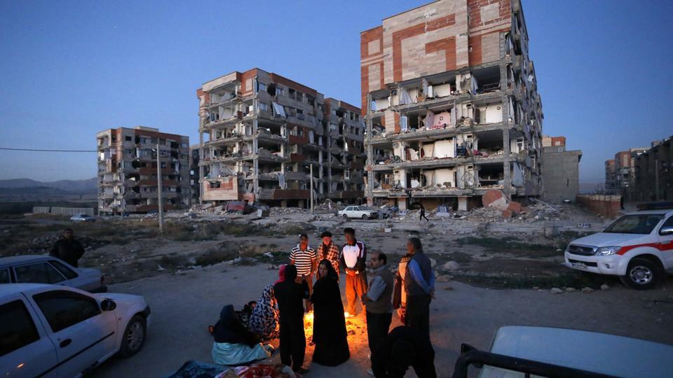 Survivors warm themselves in front of destroyed buildings after an earthquake at the city of Sarpol-e-Zahab in western Iran. --- AP