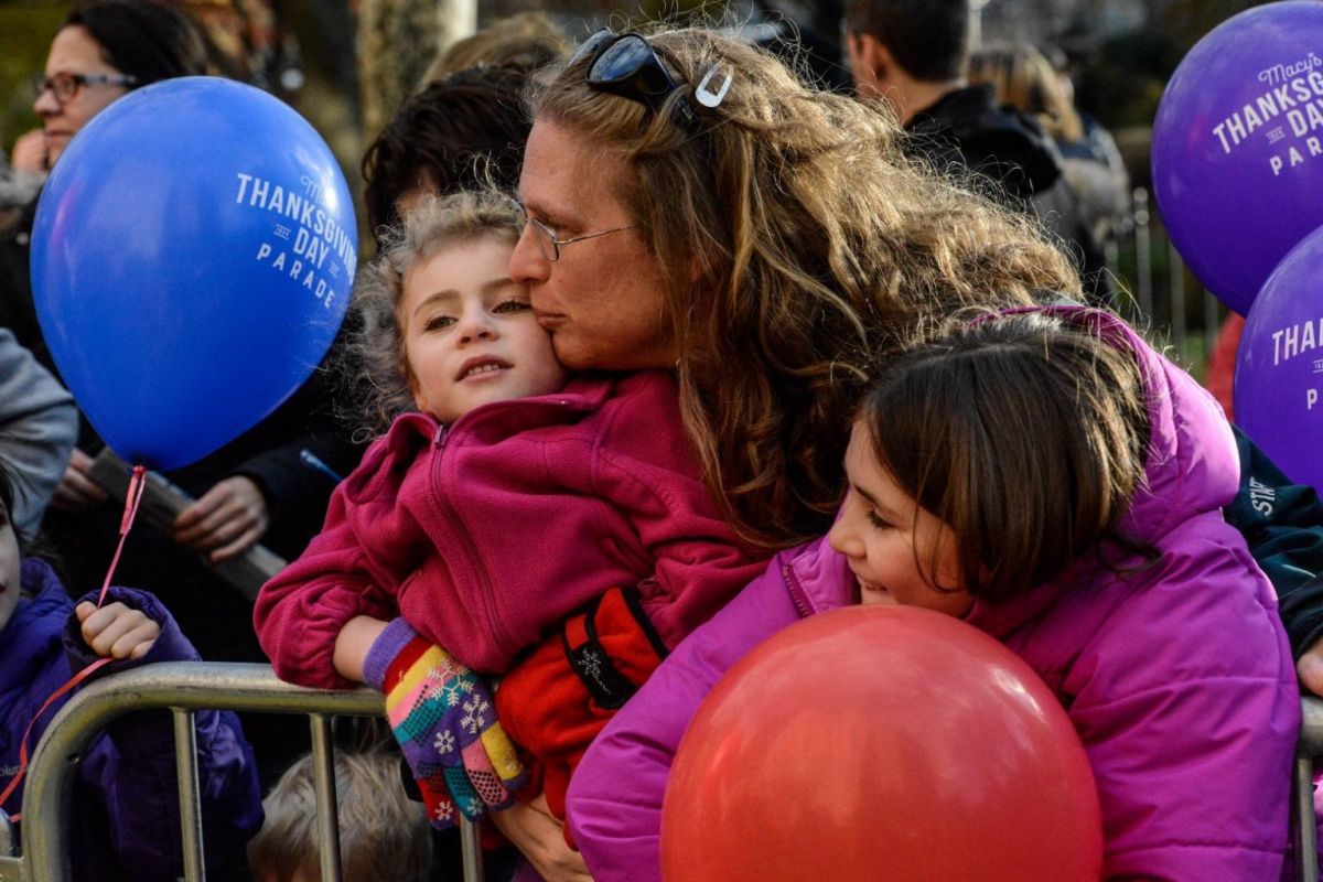 A woman kisses a child as they watch the Macy’s inflation team inflate balloons near Central Park ahead of the Macy’s Thanksgiving Day parade. Photo: AFP