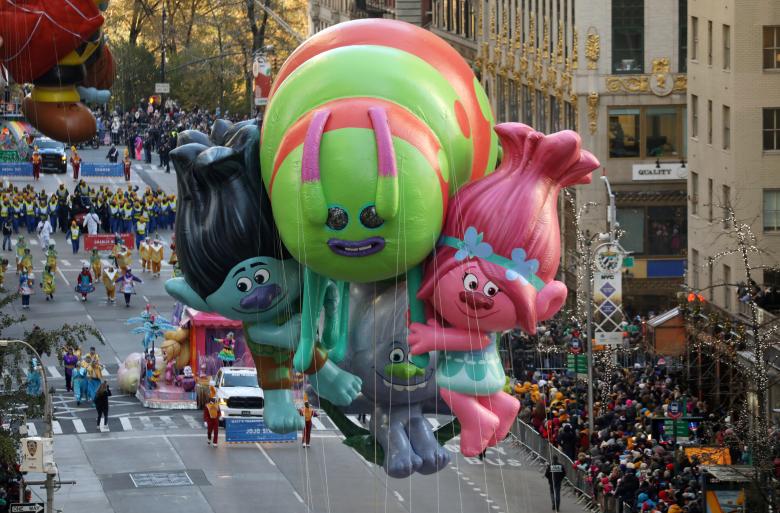 The DreamWorks Animation Trolls balloon make its way down 6th Ave. Photo: Reuters