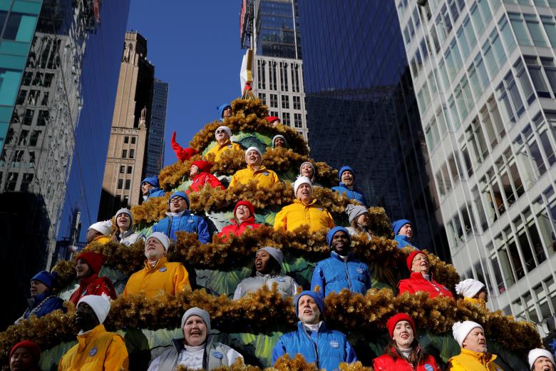 People sing carols in the Macy’s Singing Christmas Tree on 6th Avenue. Photo: Reuters
