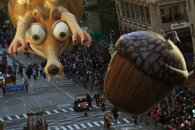 The Ice Age’s Scrat and his Acorn balloon are carried. Photo: Reuters