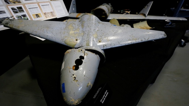 A kamikaze drone is seen on display that the Pentagon claims was manufactured by Iran. --- Reuters