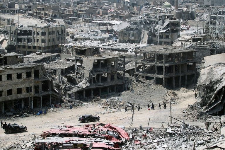 A picture taken on July 9, 2017, shows Iraqi forces walking amidst the destruction in Mosul’s Old City. Photo: AFP