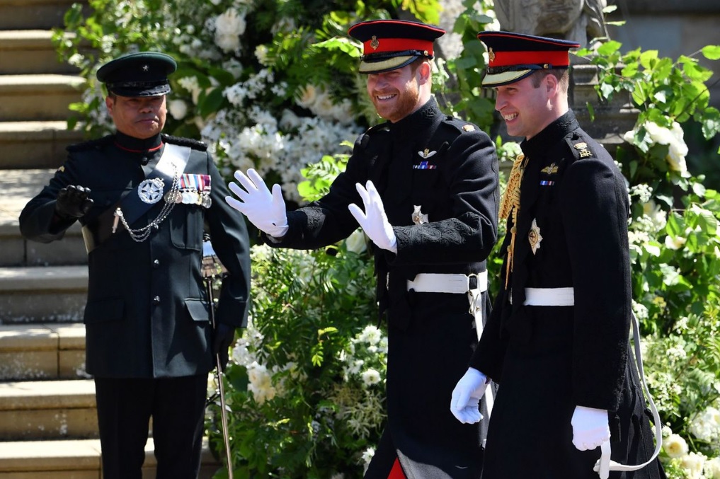 Prince Harry, the newly titled Duke of Sussex, arrives with his best man and brother Prince William, Duke of Cambridge, in military uniform. Photo: Getty