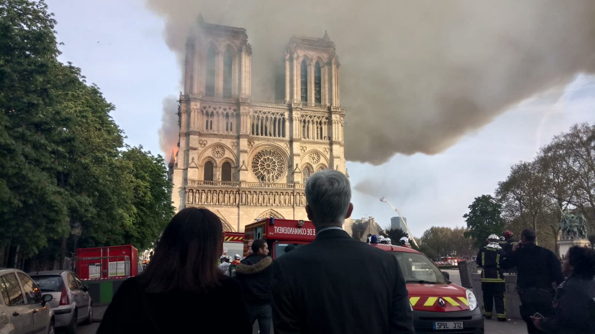 Gasps and cries of "Oh my god" erupted around an hour after the fire first broke out when the top portion of the church s spire came crashing down.