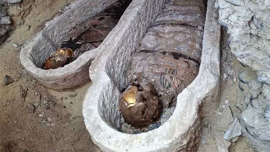 Several mummies were found in wooden coffins, wrapped in linen featuring elaborate geometric patterns on them.