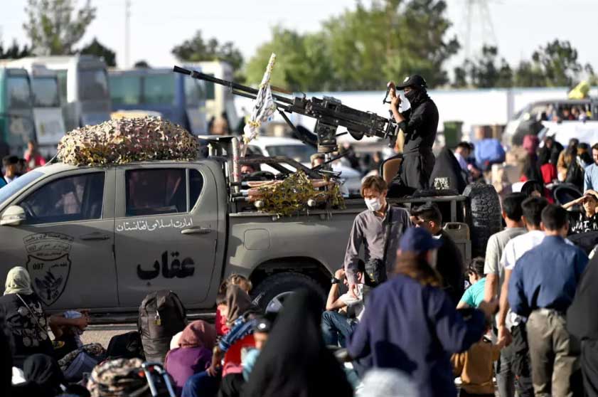 A Taliban security officer on the back of a vehicle at the Islam Qala border crossing between Afghanistan and Iran.
