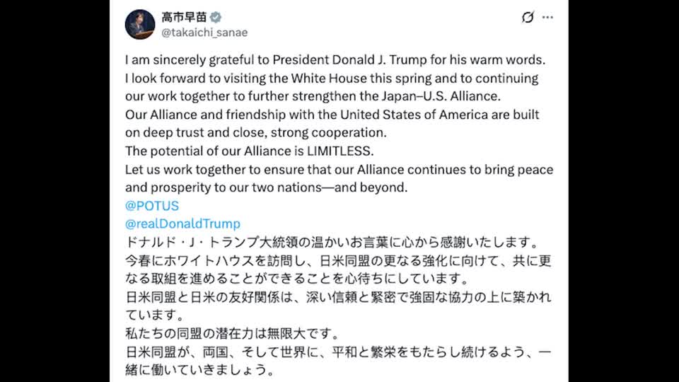 "I look forward to visiting the White House this spring and to continuing our work together to further strengthen the Japan-US Alliance," she wrote on X. "Our Alliance and friendship with the United States of America are built on deep trust and close, strong cooperation. The potential of our Alliance is LIMITLESS."