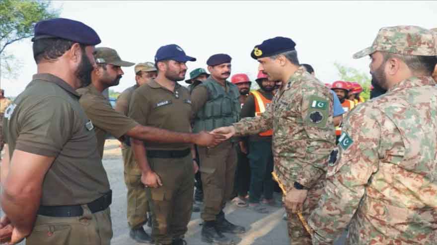 Major General Julian Moazzam reviews flood relief efforts at a camp in Sargodha