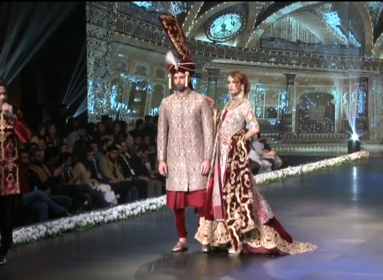 Models adorning bridal dresses festooned the ramp with their grooms and got appreciation from the spectators.