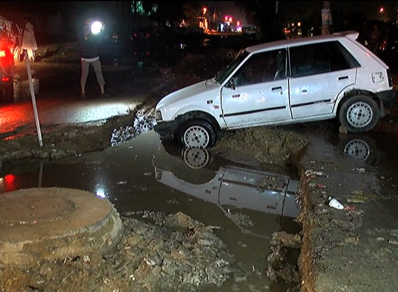 On Monday night, the provincial government had declared rain emergency due to downpour. Five vehicles parked on a road under construction in North Nazimabad sank and citizens had to tow the cars on their own.
