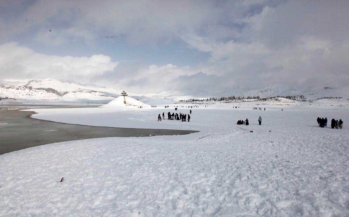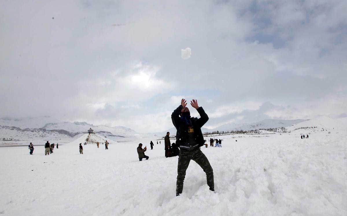 People enjoy snowfall during their visit to Hanna Lake in Quetta (ONLING PHOTO)