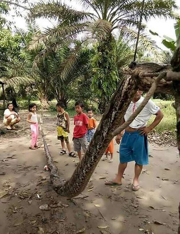 Hungry locals later killed the snake and displayed its body in the village before dicing it up, frying it and feasting on it.